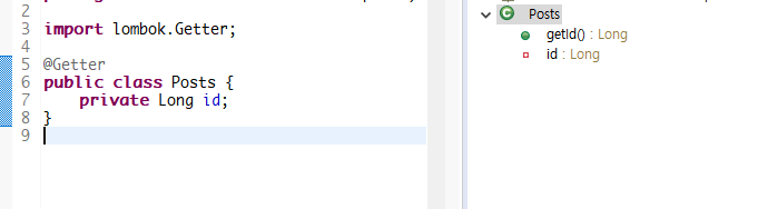 위와 같이 Outline에는 Getter 메서드가 보이지 않는다.(Lombok을 사용하는 이유가 없음)