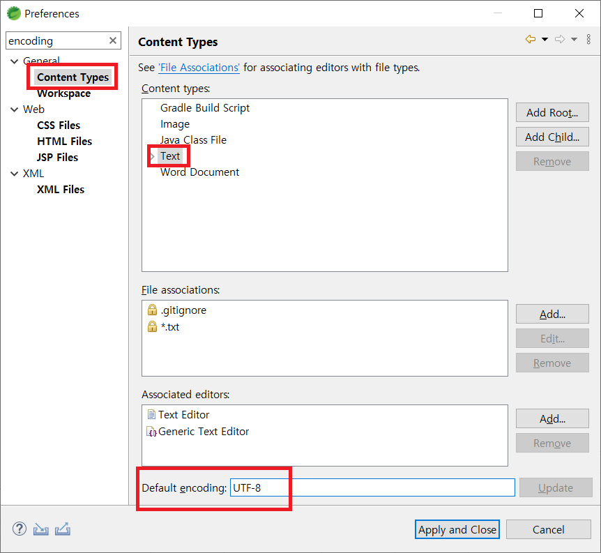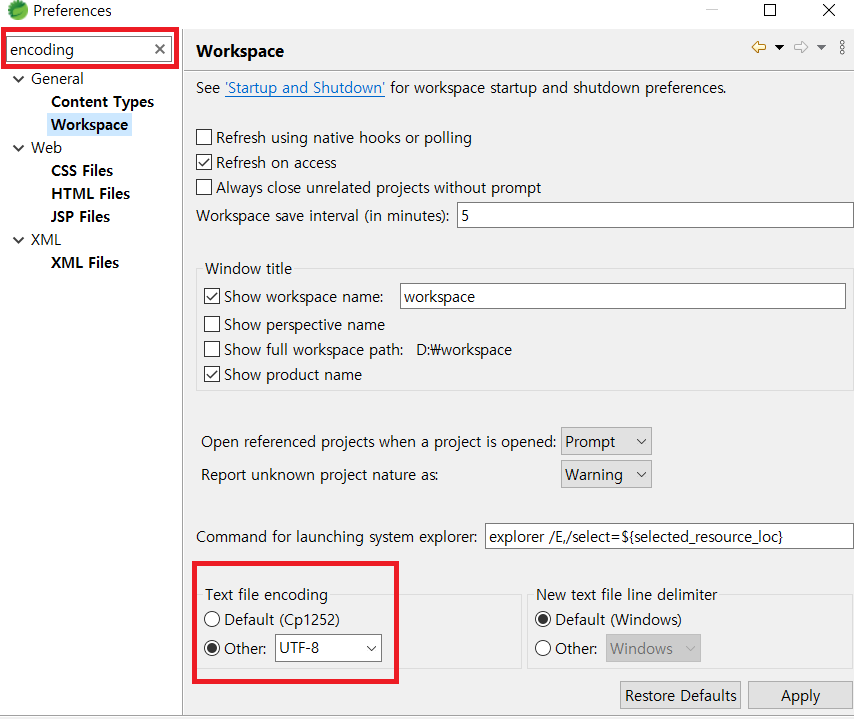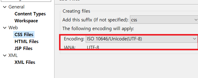CSS, HTML, JSP, XML 항목의 encoding 부분도 UTF-8로 설정