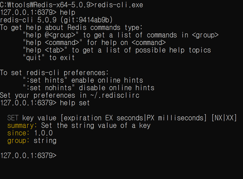 1. 다른 프롬프트를 열고 redis-cli.exe를 실행한다. 해당 프로그램으로 redis client를 이용할 수 있다.