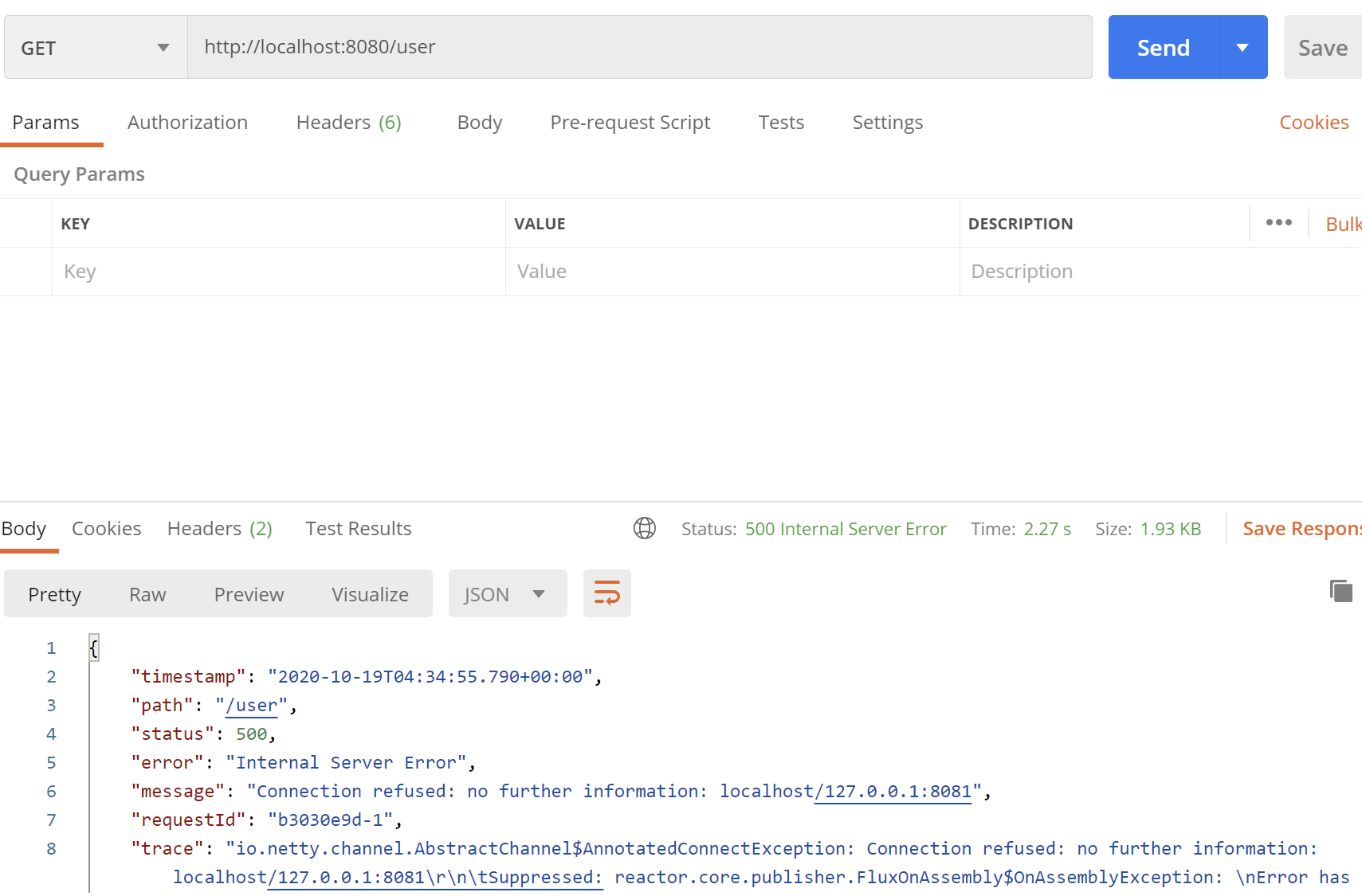 위까지 설정을 했으면 gateway가 정상 작동하는지 http://localhost:8080/user를 호출해보자. 아래와 같이 에러가 나면 정상적으로 라우팅은 되는것, 아직 서비스를 구현안했으니 에러가 발생한다.