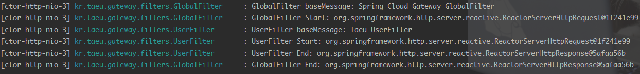 http://localhost:8080/user 호출시 path=/user/** 조건에 의해 http://localhost:8081/user로 라우팅 될 것이고, 그 과정에서 GlobalFilter를 거쳐 UserFilter를 거치게 될 것이다.