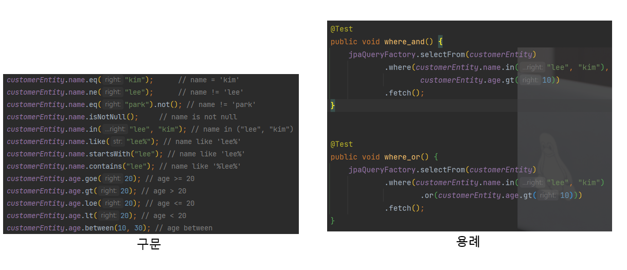 - where: 쿼리 필터를 추가한다. 가변인자나 and/or 메서드를 이용해서 필터를 추가한다.