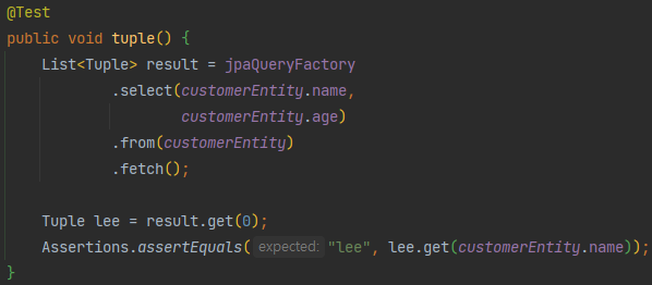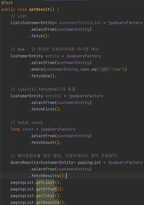 - fetchOne: 단건 조회(복수결과시 에러)