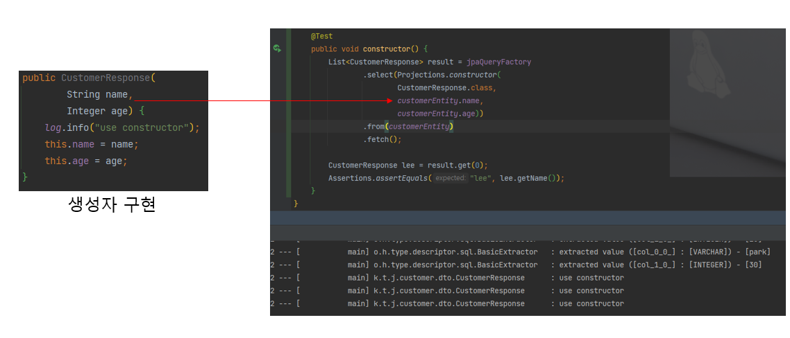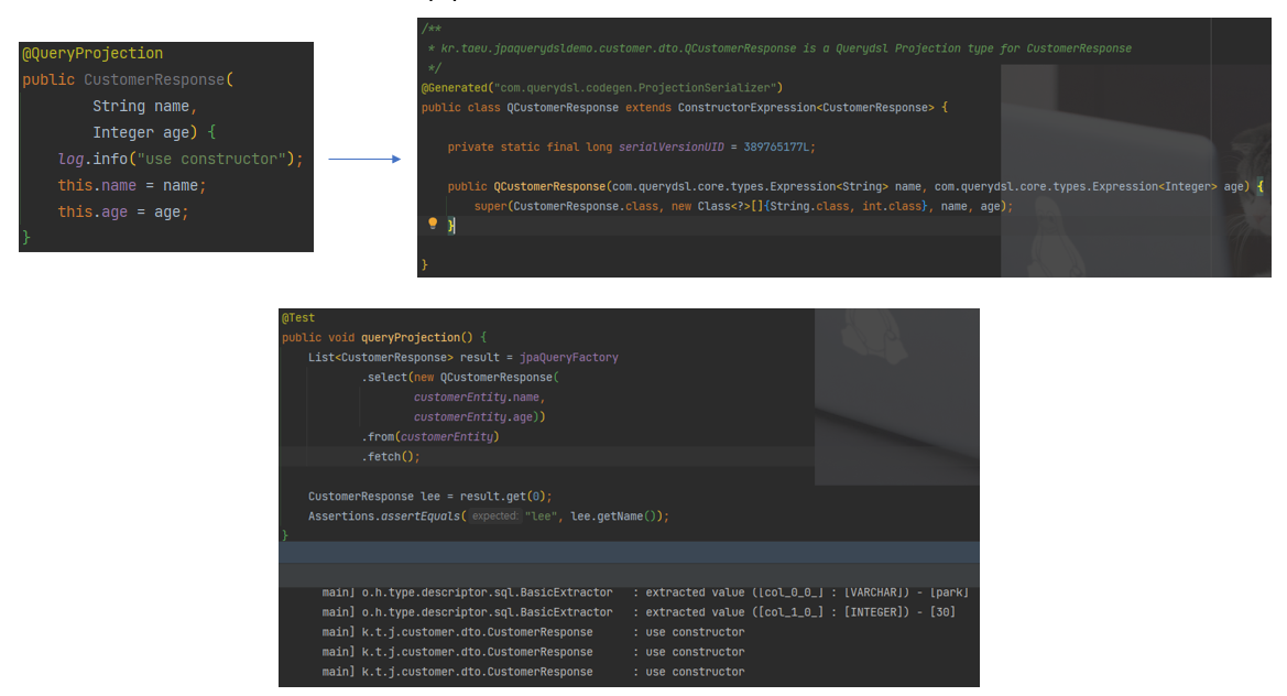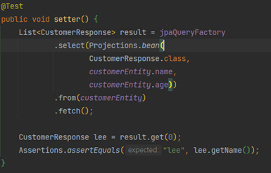 @QueryProjection 어노테이션을 생성자에 달면, 해당 생성자 기반으로 쿼리타입이 생성된다. 이를 이용해 IDE 자동완성을 이용하면서 생성자 방식의 결과 처리를 진행할 수 있다.