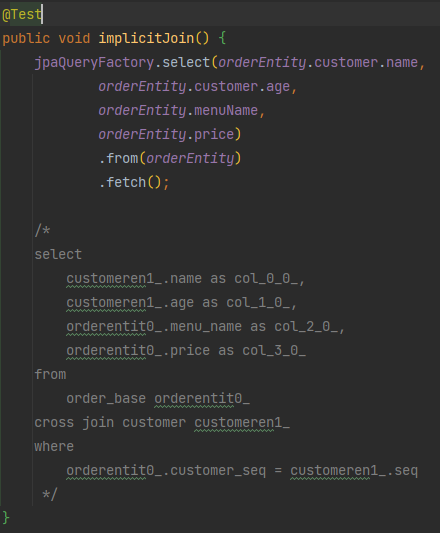 - JPQL에서는 select절에서 의존성을 가지는 다른 엔티티 객체를 조회 하려할 때 JPA가 알아서 PK와 FK를 가지고 해당 테이블과 조인을 해준다. 하지만 cross join이 발생 할 수 있으므로 명시적 조인이 권장된다.