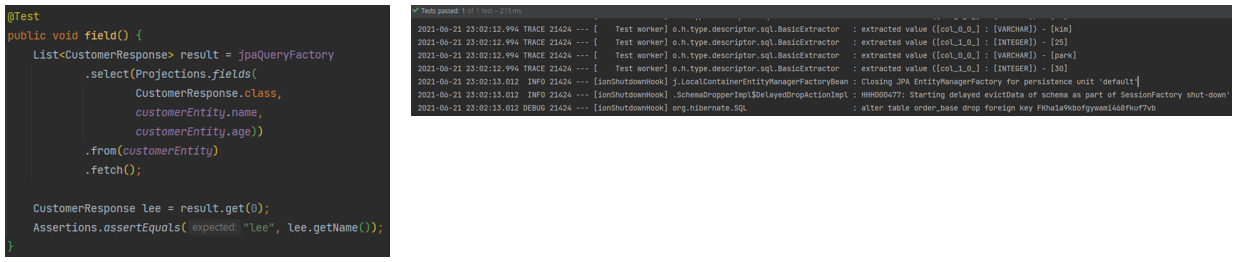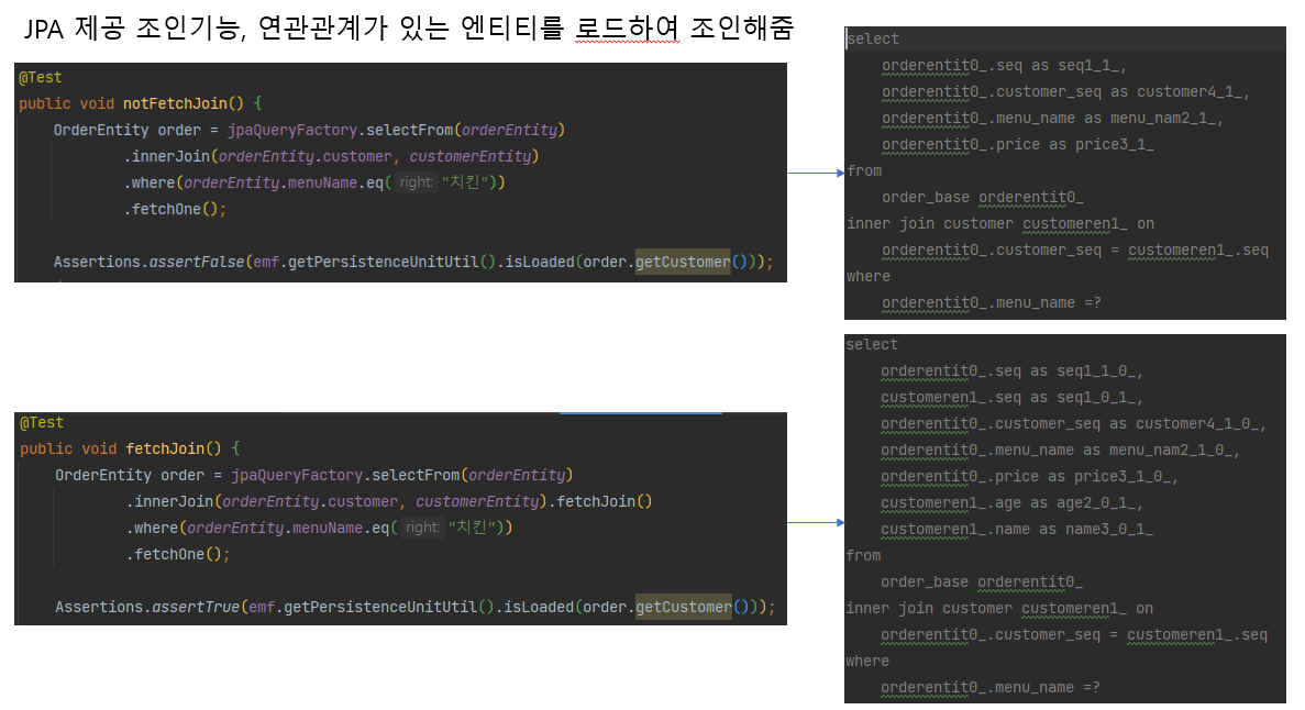 실제로 쿼리수행시 FetchJoin테스트의 쿼리문은 customerEntity의 내용도 포함한다.