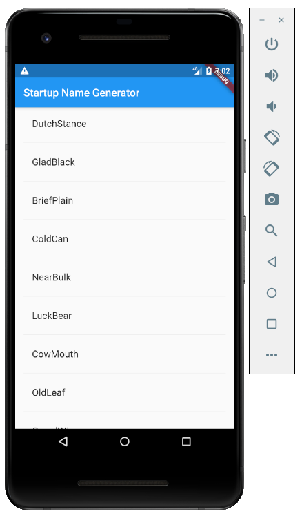 class MyApp extends StatelessWidget { @override Widget build(BuildContext context) { //final wordPair = WordPair.random(); return MaterialApp( title: 'Startup Name Generator', home: RandomWords(), ); } } - app을 재시작하면, 우리는 얼마나 스크롤하던 문제 없는 단어 리스트를 볼 수 있다!