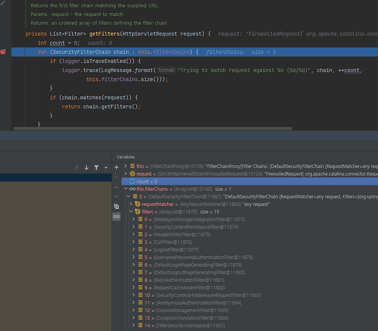 AccessDecisionManager를 사용하여 Access Control 또는 예외 처리하는 필터, 대부분의 경우 FilterChainProxy에 제일 마지막 필터로 들어있다. Authorization(인가)를 시도한다 이때 accessDecisionManage.decide메서드를 호출하는데, AccessDeniedException이 발생하면 그전 단계인 ExceptionTranslationFilter에서 예외를 처리한다. private void attemptAuthorization(Object object, Collection attributes, Authentication authenticated) { try { this.accessDecisionManager.decide(authenticated..